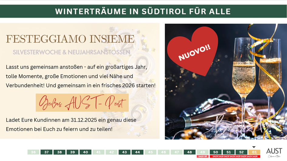 Die letzten Tage des Jahres sind geprägt von Nostalgie, Dankbarkeit und der leisen Vorfreude auf einen Neuanfang. In dieser besonderen, familiären und festlichen Atmosphäre möchten wir gemeinsam mit unseren Kundinnen auf ein großartiges Jahr anstoßen, Erinnerungen teilen und bewusst Zeit füreinander schenken.