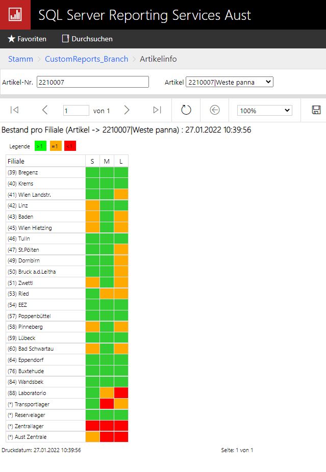 Im Report Artikelinfo kannst du dir die Verfügbarkeit eines bestimmten Artikels über alle Filialen anzeigen lassen.