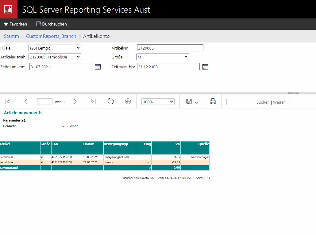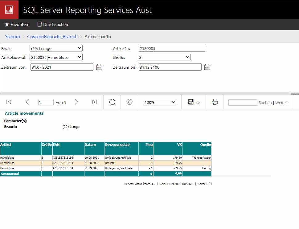Hier siehst du in der zweiten Zeile, dass der Artikel am 27.08. verkauft wurde. Am 10.08. hast du den Artikel aus dem Transportlager erhalten (UmlagerungANFiliale)