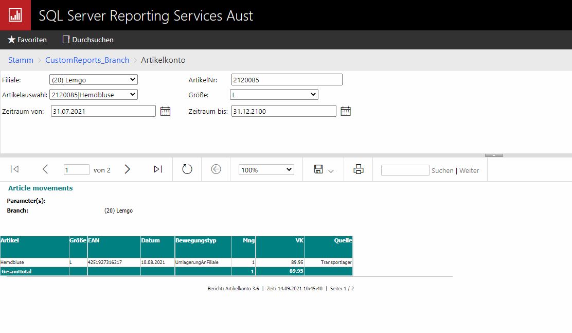 Hier kannst du die “Bewegungen” eines Artikels einer gewählten Größe nachschauen. Warenein- & ausgänge, Umlagerungen, Verkäufe und das jeweilige Datum werden angezeigt.