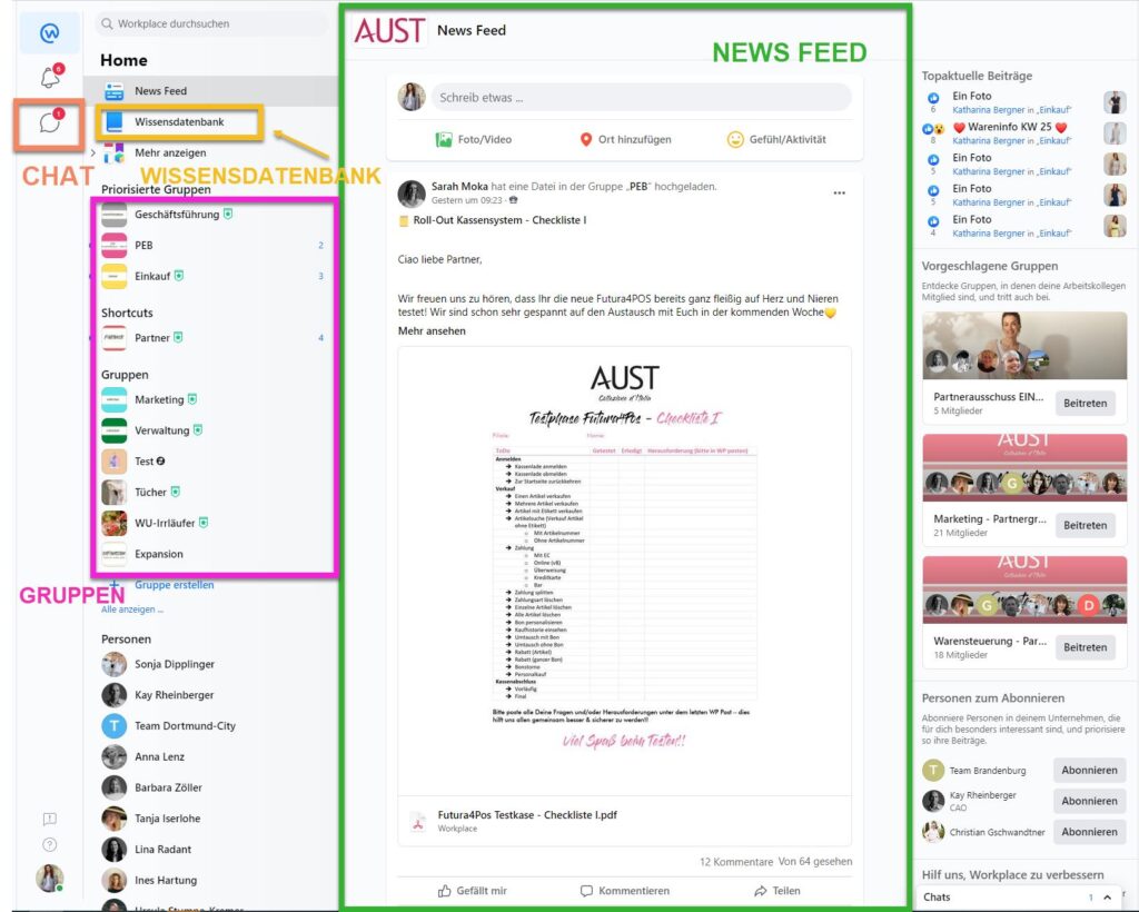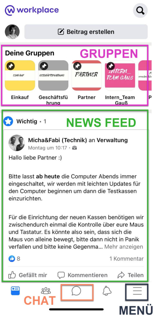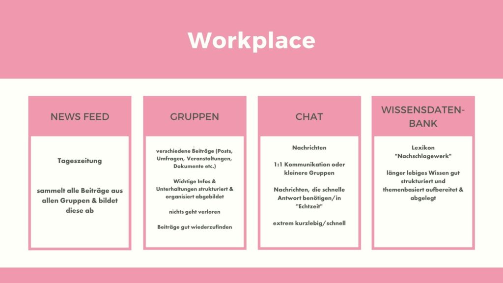 In Workplace gibt es vier Bereiche/Hauptfunktionen. Was diese unterscheidet und wofür wir was nutzen, zeigt dir dieser Beitrag.