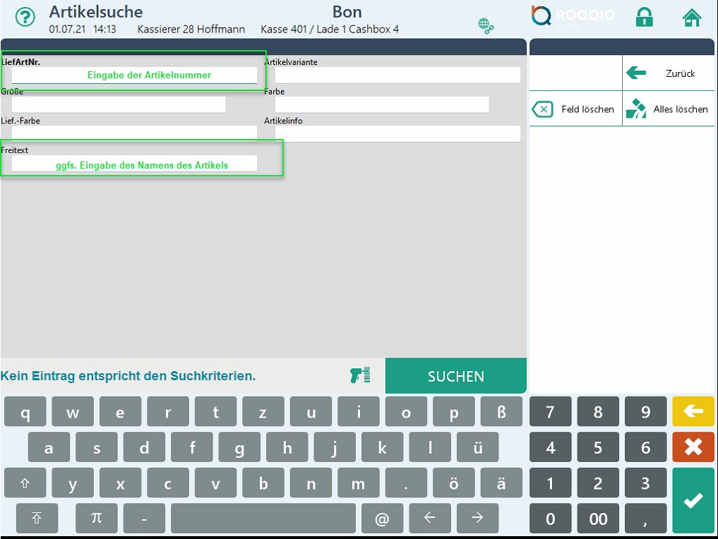 3. Scanne den gesuchten Artikel oder gib die Artikelnummer (siehe auch Beitrag neue Artikelnummern) in das Feld “LieferArtNr.” ein. Wenn du die Artikelnummer nicht vorliegen hast, kannst du im Feld “Freitext” den Namen des Artikels eingeben (zb. Basic Top). Durch Eingabe weiterer Suchkriterien wie bspw. Größe oder Farbe kannst du die Suche weiter eingrenzen.