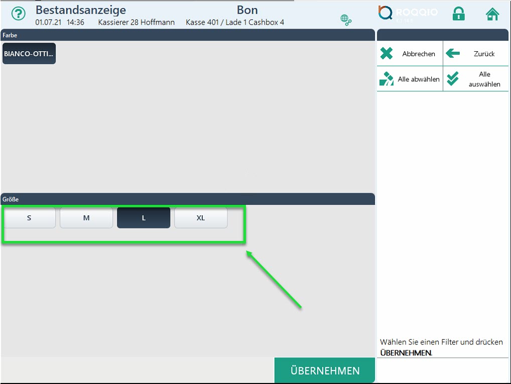 5. Wähle nun die Größe des Artikels aus (grün markiert) für welchen du den Bestand sehen möchtest. Du kannst auch alle Größen gleichzeitig anwählen (Menü rechts “Alle auswählen)