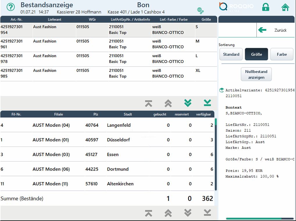 6. Wähle die entsprechende Größe aus für die du die Bestände sehen möchtest. (Ausgewählte Zeile ist grau hinterlegt) Du erhältst nun eine Übersicht über den Bestand des Artikels & dessen Bestände.