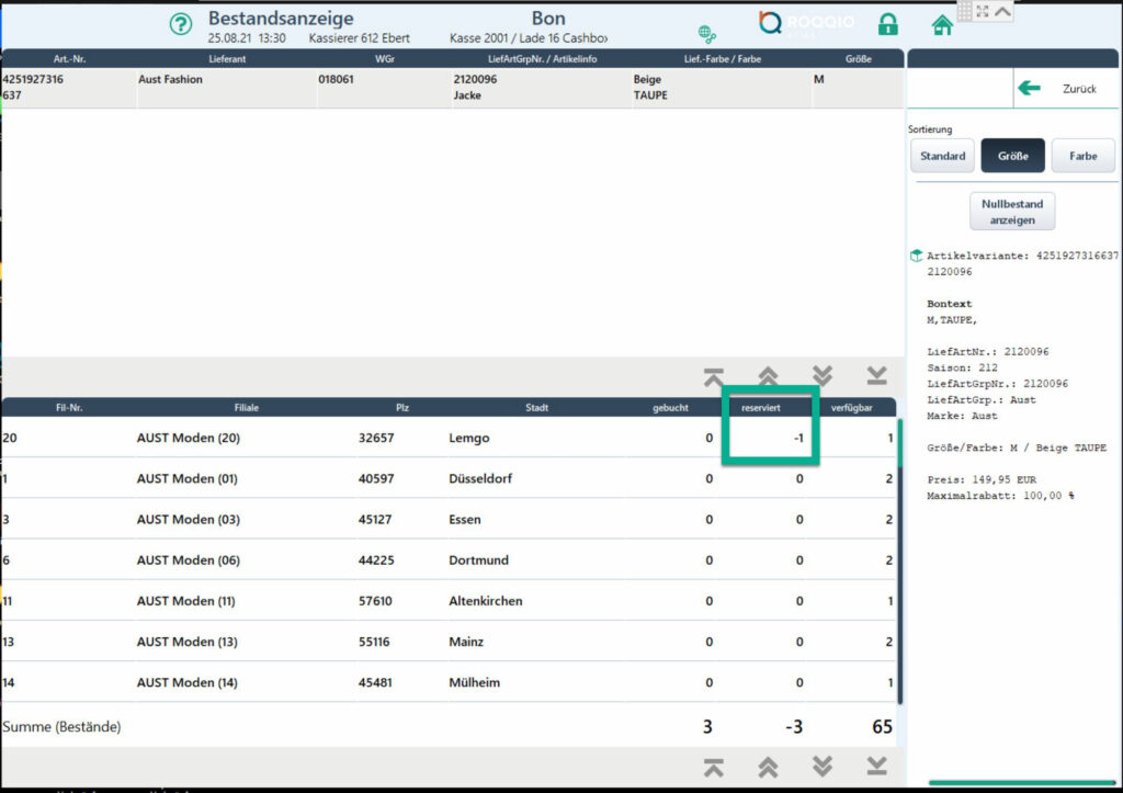 Hinweis: Wurde eine Auswahl auf einen Artikel gebucht, siehst du hierzu einen Vermerk in der Spalte “reserviert”