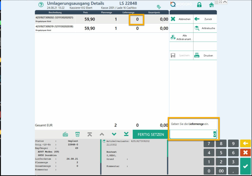 4. Gib nun bei der Liefermenge “0” ein in der entsprechenden Zeile