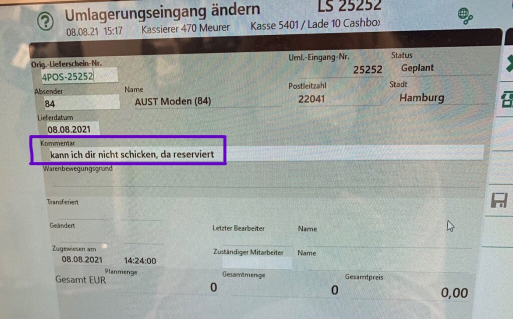 5. Gehe “zurück” auf “Umlagerungseingang ändern” und trage den Grund des Abbruchs entsprechend der Richtlinien in das Kommentarfeld (lila Markierung) ein.