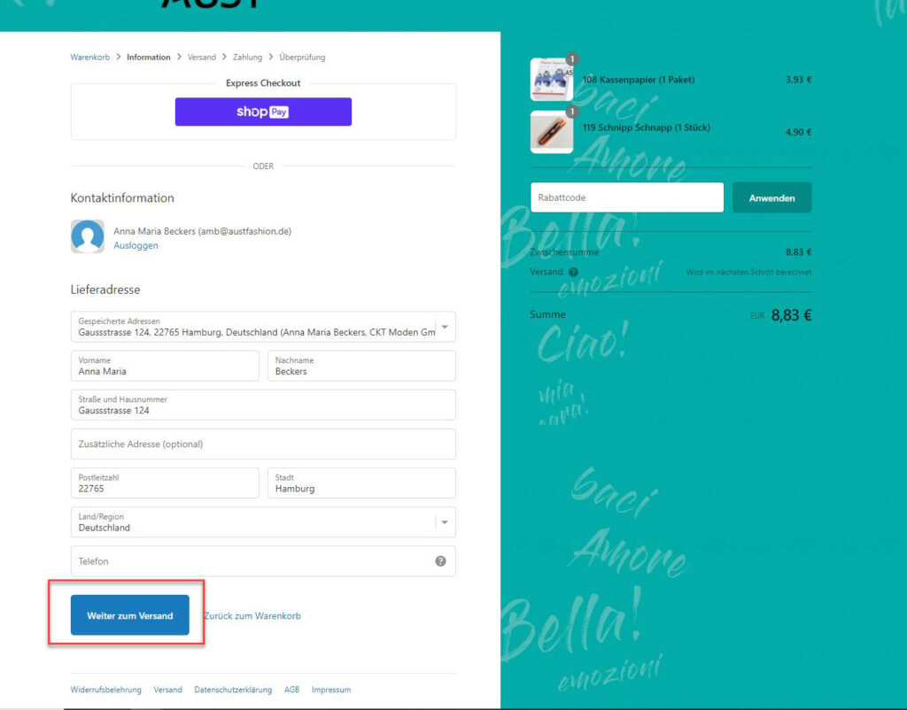 8. Fülle die unbefüllten Felder des Formulares aus und klicke auf ” Weiter zum Versand”
