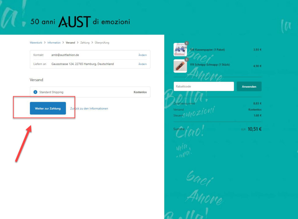 10. Wähle die gewünschte Zahlungsart aus, bestätige die Lieferadresse & klicke unten auf “Bestellung überprüfen”