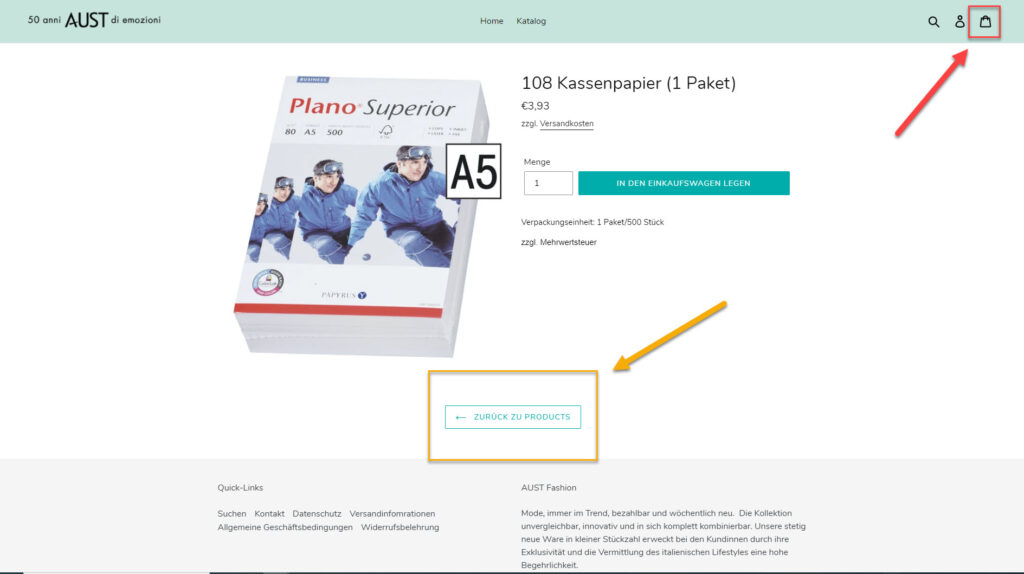 6. Du kannst nun entweder weiter einkaufen mit einem Click auf “Zurück zu den Produkten” (orangene Markierung) oder du begibst dich zu deinem Einkaufswagen, um den Bestellvorgang fortzuführen/abzuschließen. Klicke hierfür auf das Symbol oben rechts (rote Markierung).