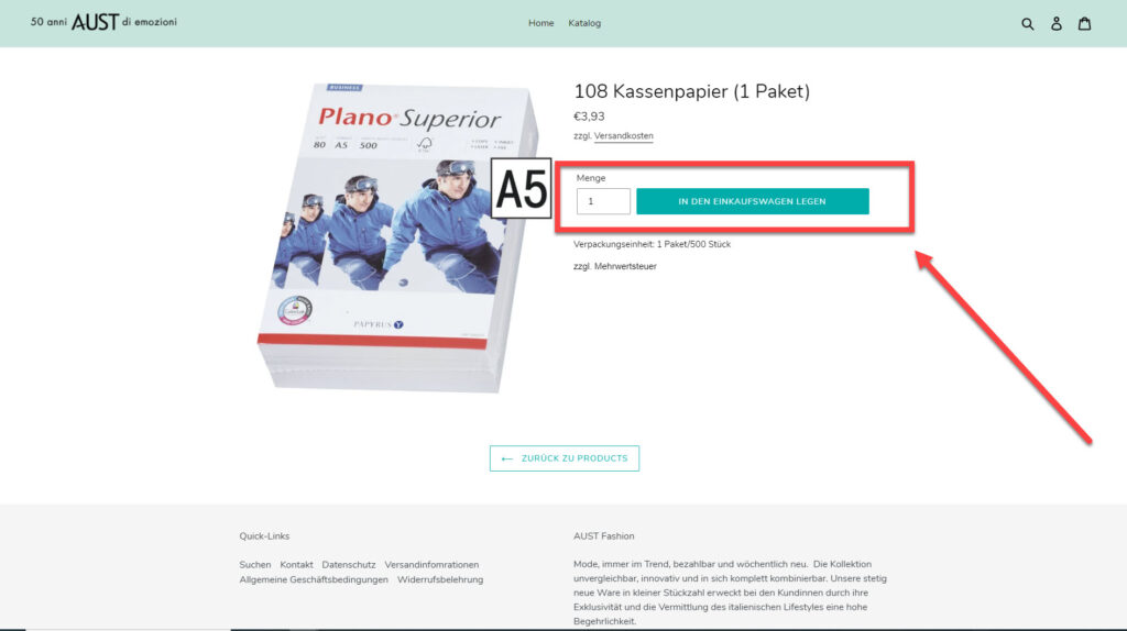 5. Wenn du das gewünschte Produkt angeklickt hast, kannst du dieses in den Einkaufswagen legen durch Angabe der gewünschten Menge und klicken auf ” In den Einkaufswagen legen”