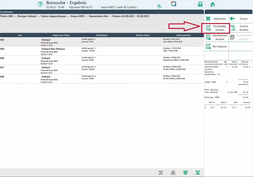 - Wähle den entsprechenden Vorgang aus & klicke im Menü rechts auf “Ersatzbeleg drucken”