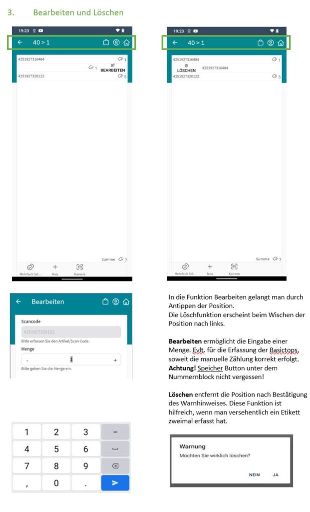 Etwas ungewöhnlich ist die Artikelanzeige. Da das Gerät „dumm“ ist, werden nur die erfassten Barcodes angezeigt. Leider keine Artikelbezeichnungen. Mit etwas Übung erkennt man aber schnell, welcher Artikel ggf. vergessen wurde. Achtung die Barcodeerkennung funktioniert sehr gut. Herumstehende Piccolos oder Schokoladenbarcodes erkennt der Scanner ebenfalls. Dafür gibt es dann auch eine Löschfunktion.