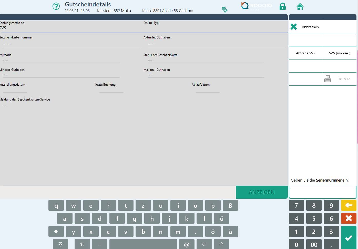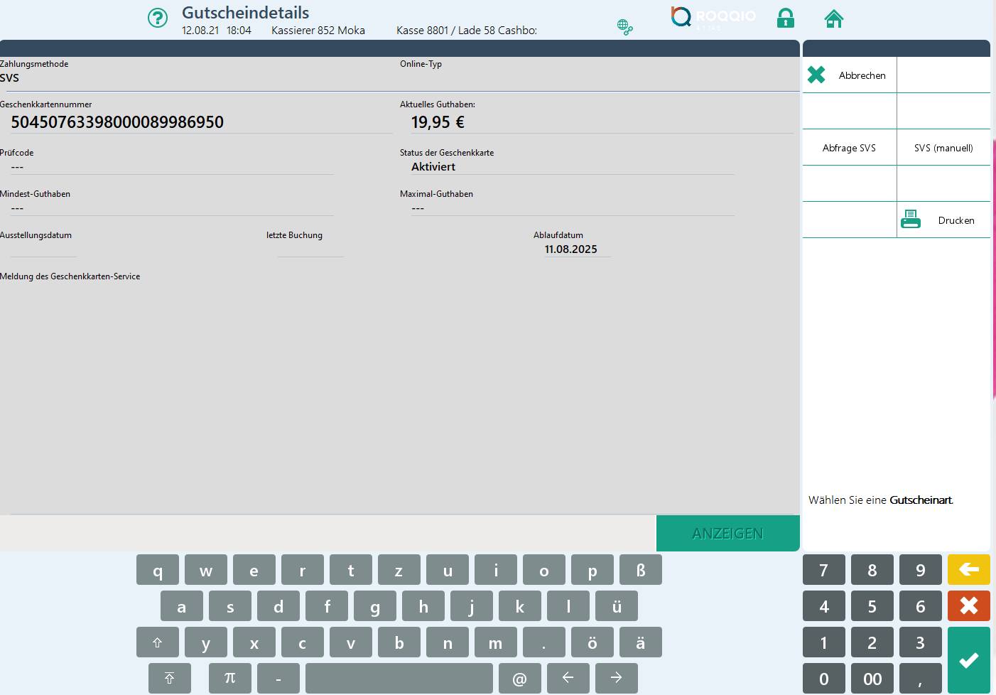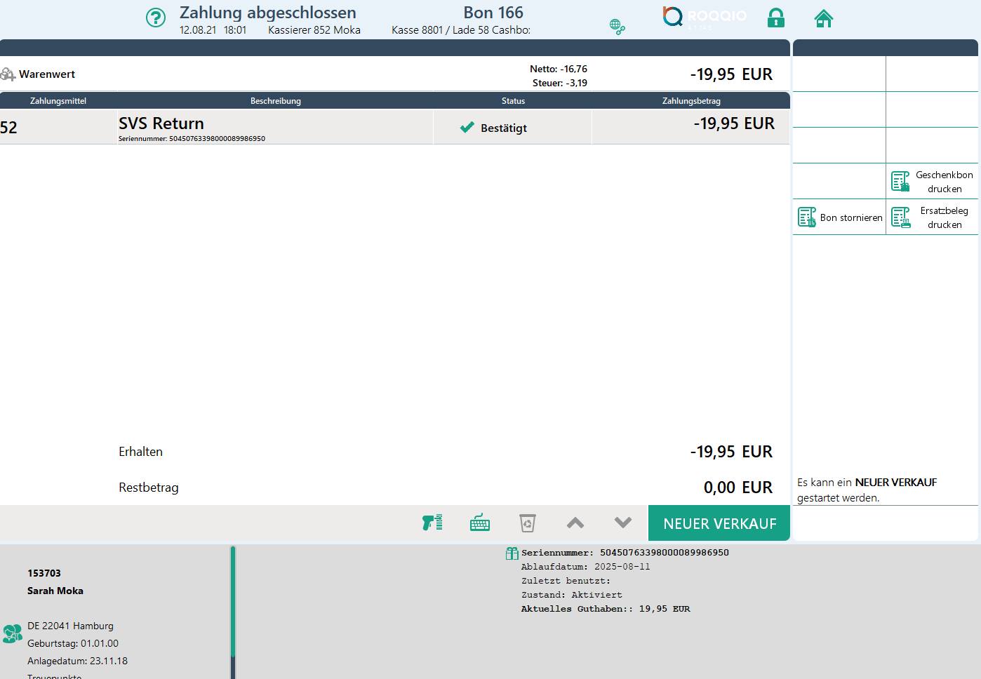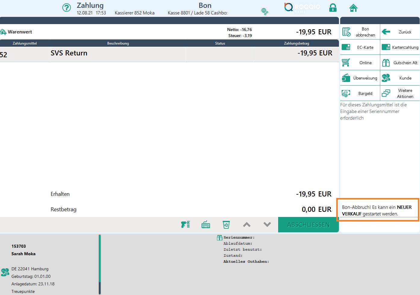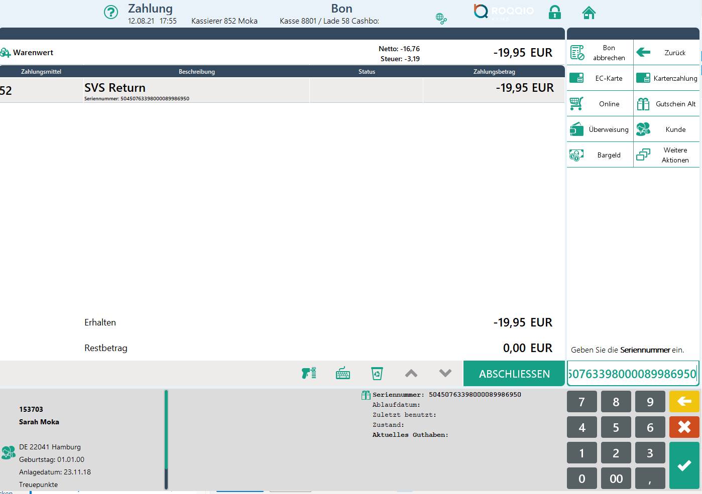 10. Nachdem der Gutschein korrekt gescannt wurde und die Seriennummer in der Zeile “SVS-Return” erschienen ist, klickst du auf “Abschließen”