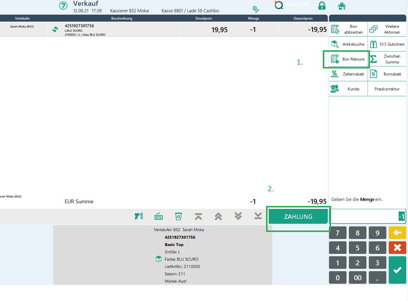 4. Der Bon wird angezeigt, Klicke den zu retourniernden Artikel an, wähle im Menü rechts “Artikel Retoure”. Sollten es mehrere Artikel sein, gehe so für jeden Artikel vor.