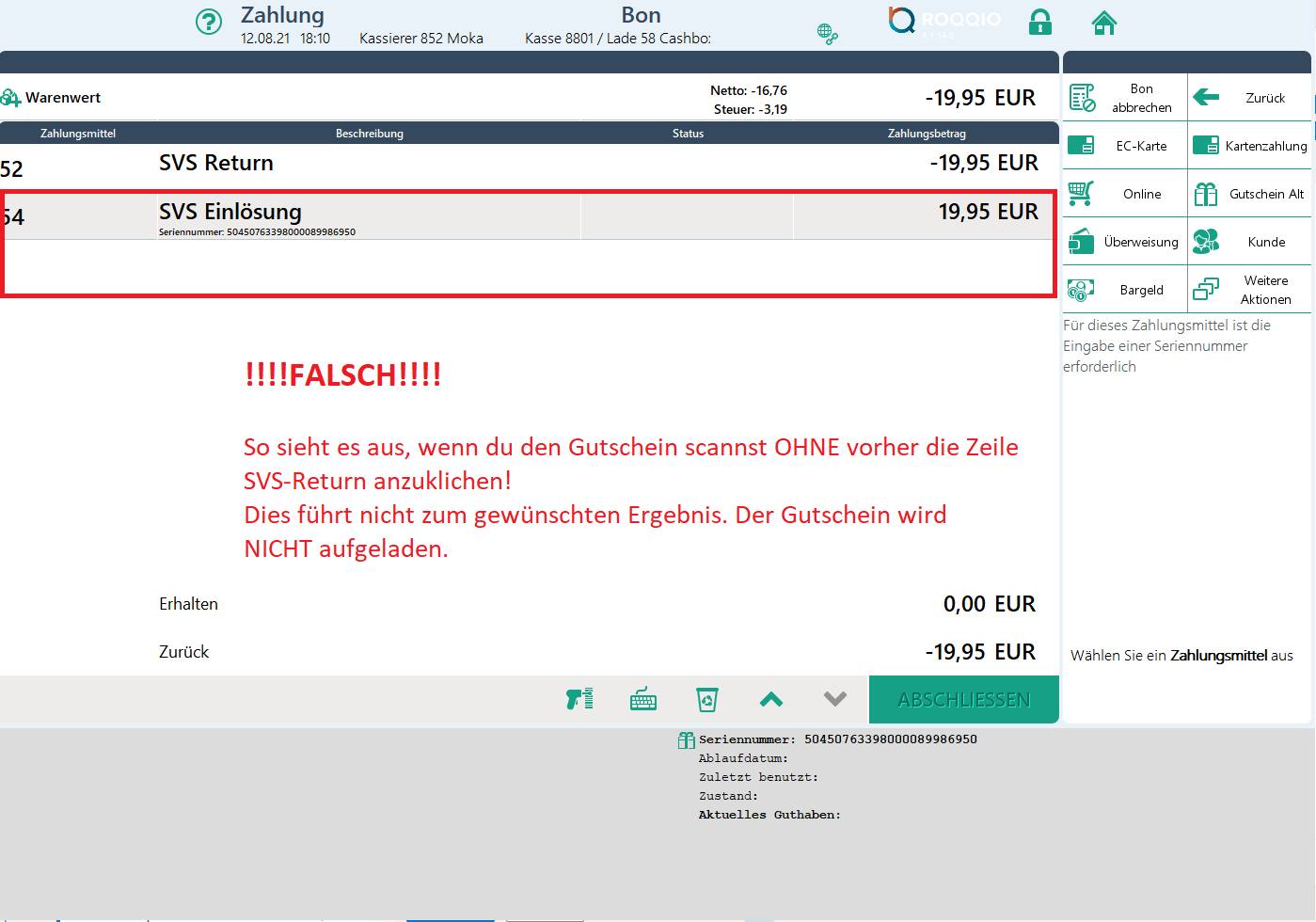 Klickst du nach Schritt 7 NICHT erst auf die Zeile SVS-Return erkennt das System den Gutschein als Zahlungsmittel (SVS Einlösung) und dein Gutschein wird NICHT aufgeladen. So sollte es NICHT aussehen: