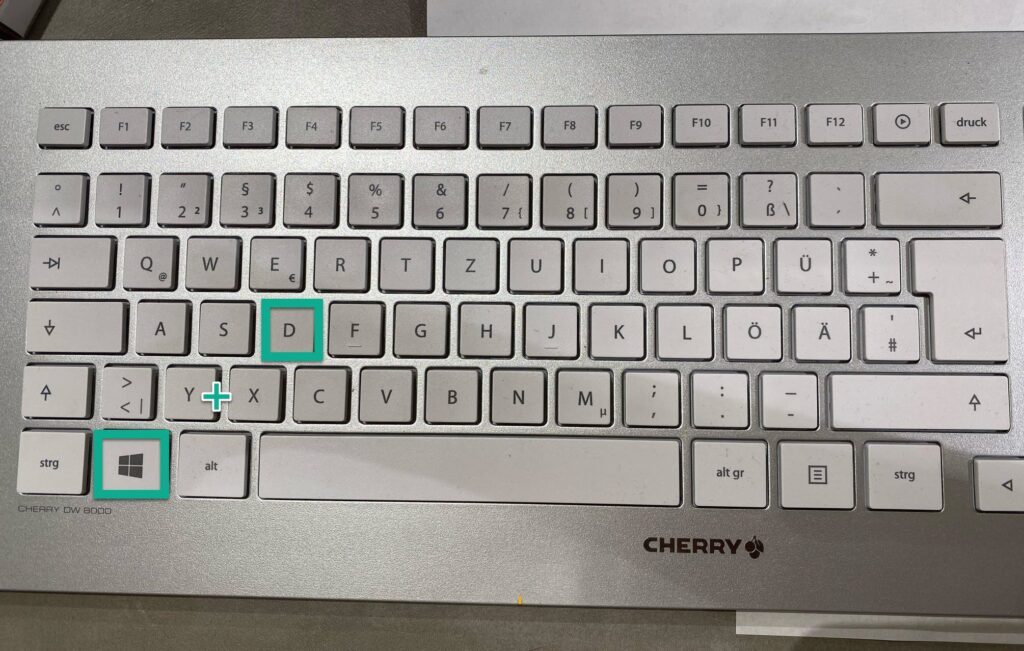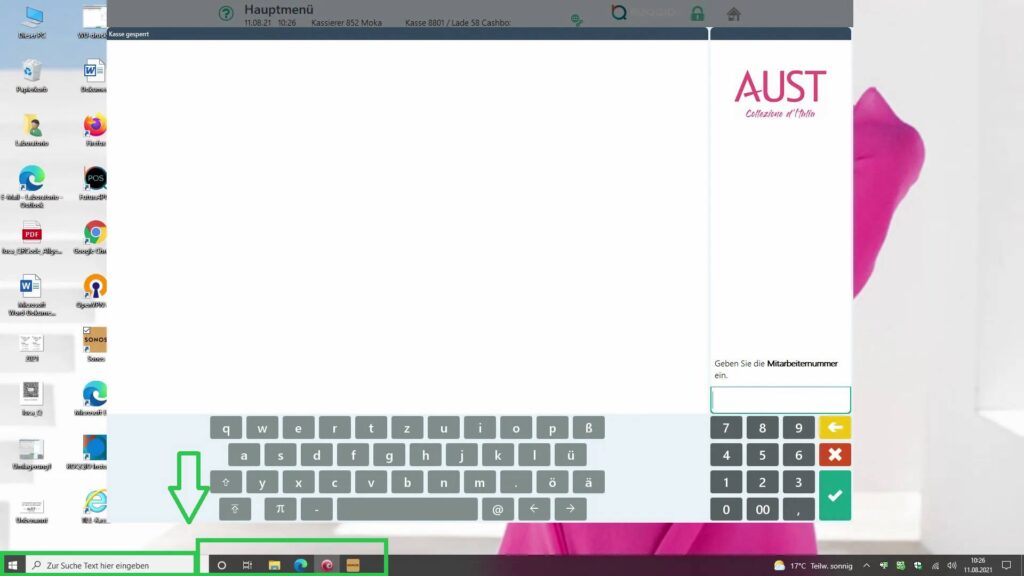 Variante 2: Du kannst das Kassenfenster “klein machen”, indem du gleichzeitig die “Windows” und die “D”-Taste (grün markiert) drückst. Um das Kassensystem wieder zuöffnen, klickst du im Anschluss einfach wieder auf das entsprechende Symbol in der Taskleiste (Erklärung weiter oben).