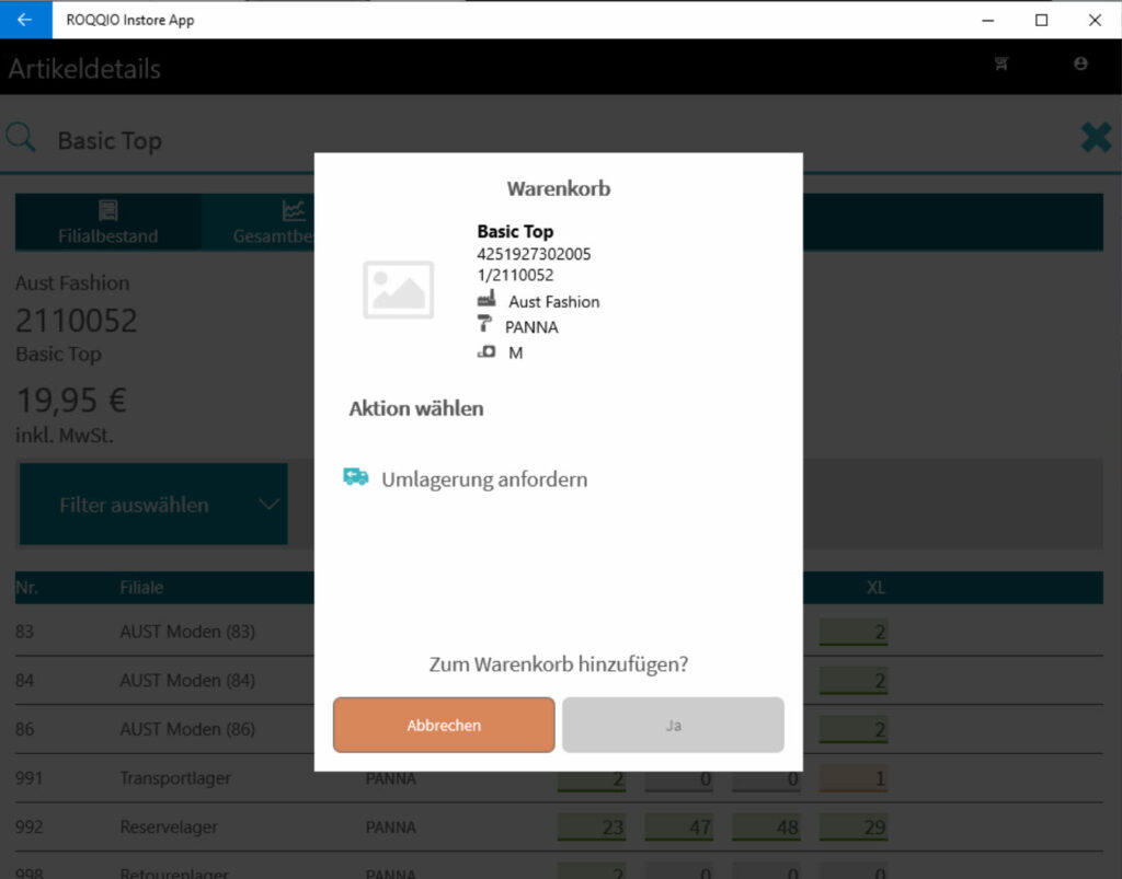 5. Wähle zb. aus dem Reservelager (992) den Artikel in der Größe M aus (durch Klicken auf das entsprechende Feld). Wenn das Lager keinen Bestand aufweist, kannst du deine Bestellung in einer anderen Casa tätigen! Dies muss aber zuvor mit der betreffenden Filiale besprochen werden!