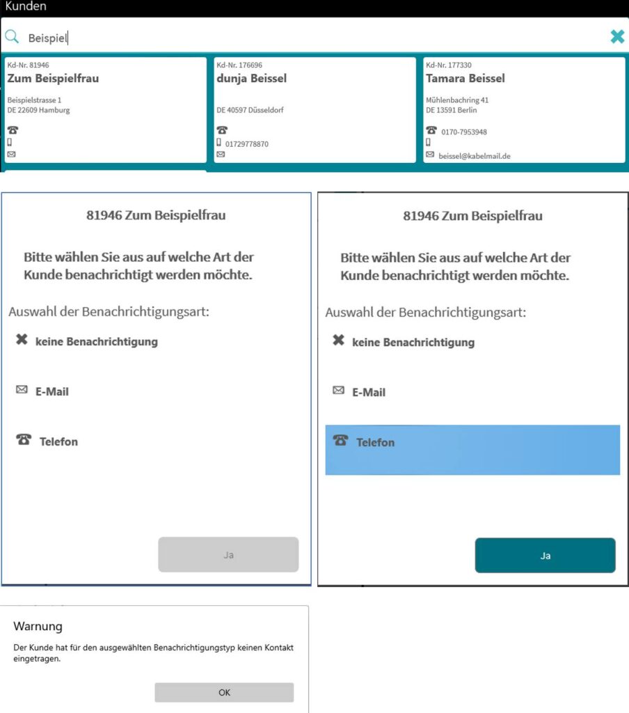 10. Wähle die Info aus, wie die Kundin über den Wareneingang benachrichtigt werden soll (Auswahl: Telefon, E-Mail, keine Benachrichtigung)