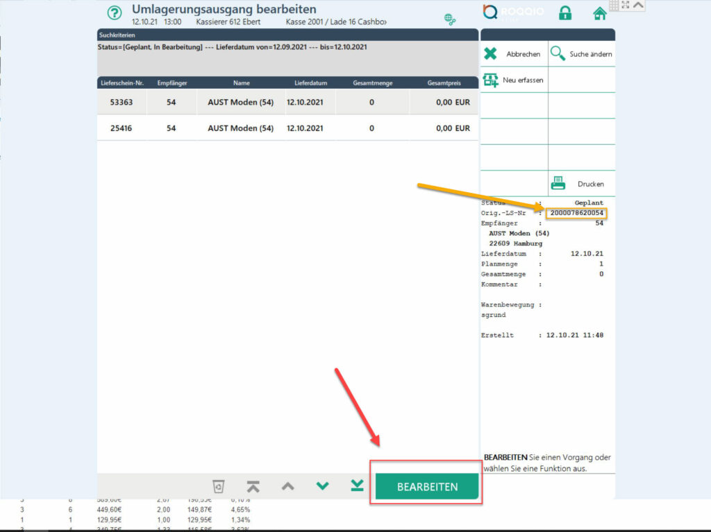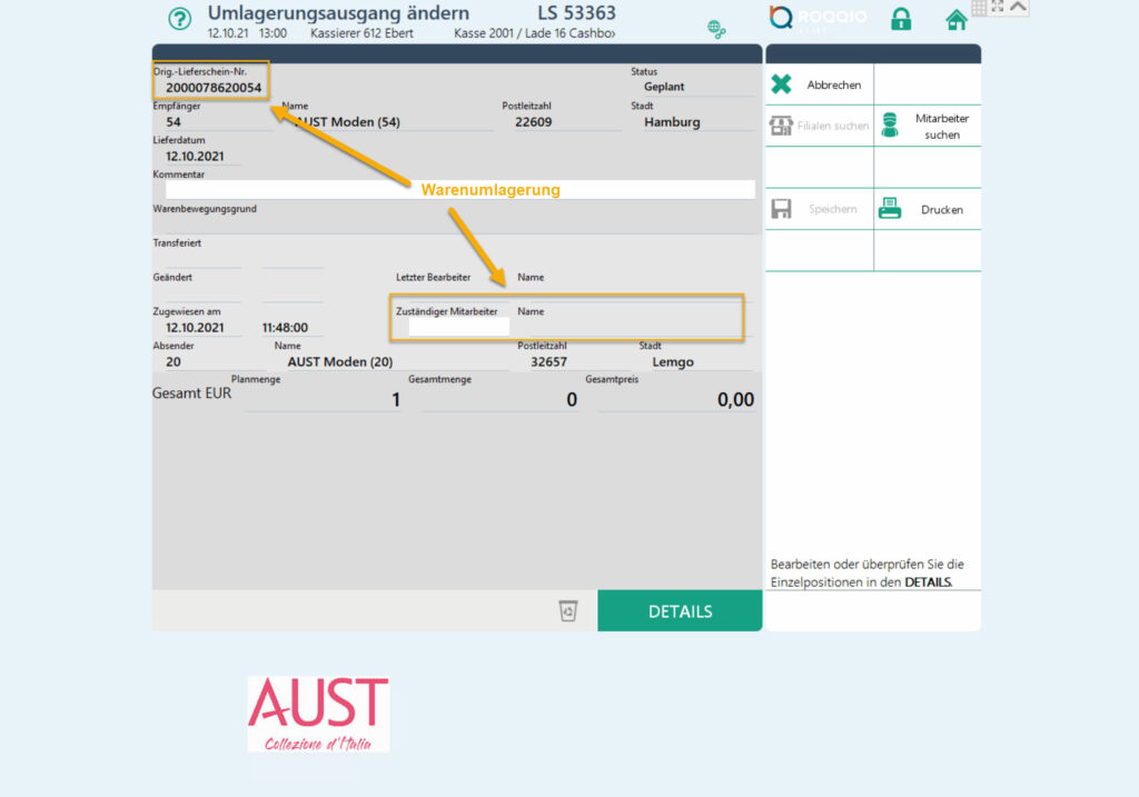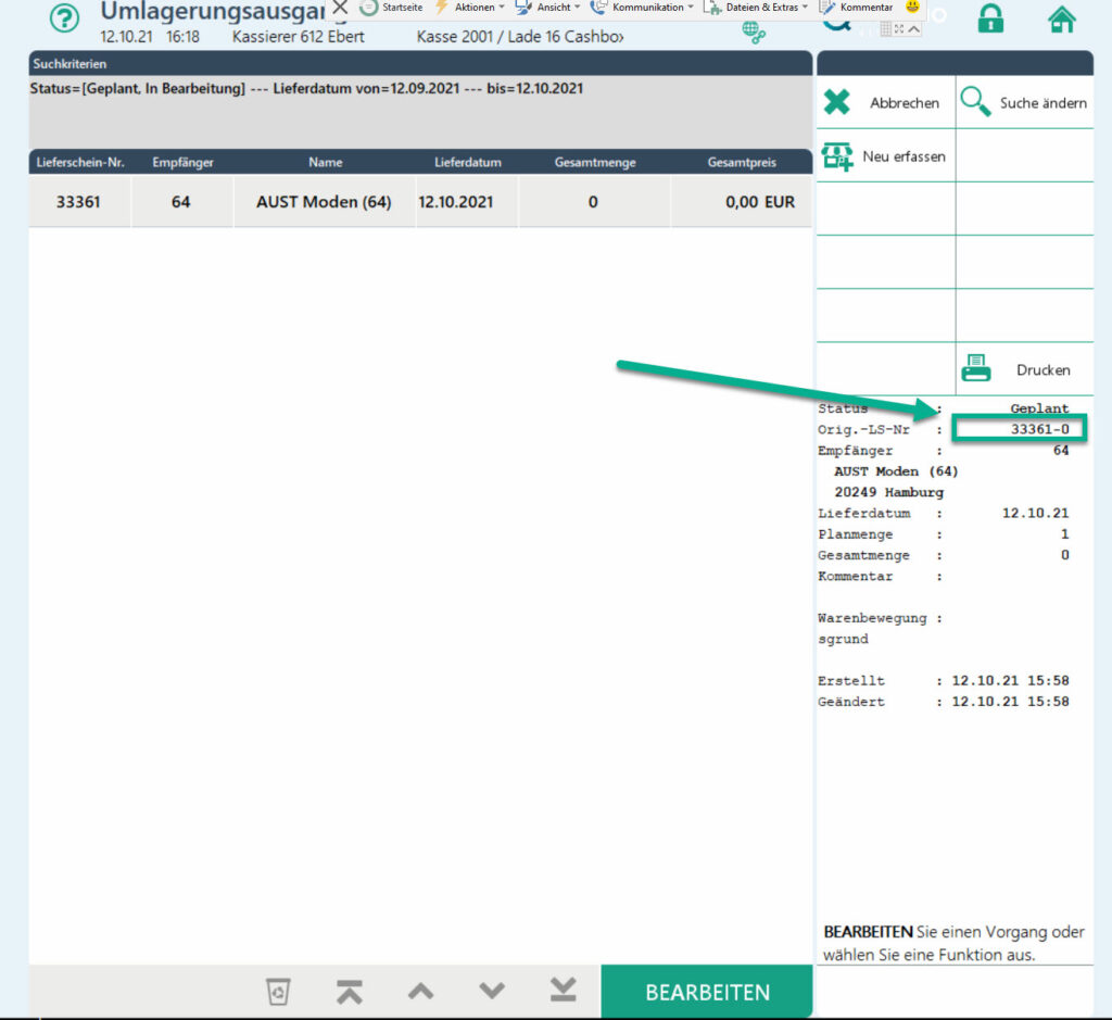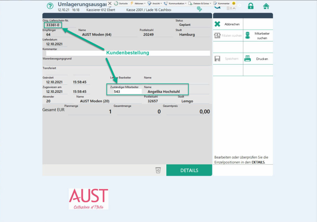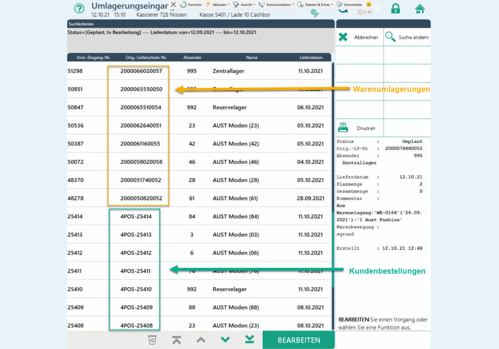 Die Warenumlagerung erkennst du an der langen Nummer erkennen & daran, dass KEIN Zuständiger Mitarbeiter eingetragen ist (gelbe Markierungen)