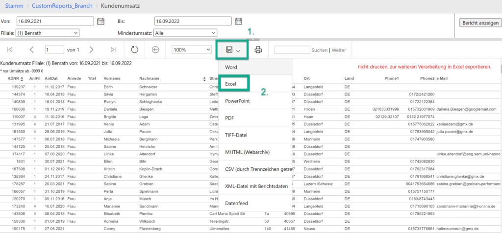 6. Klicke nun auf das kleine Disketten Symbol (Markierung 1) und wähle dann “Excel” aus (Markierung 2). Die Datei wird heruntergeladen und in deinem “Downloads-Ordner” abgelegt.