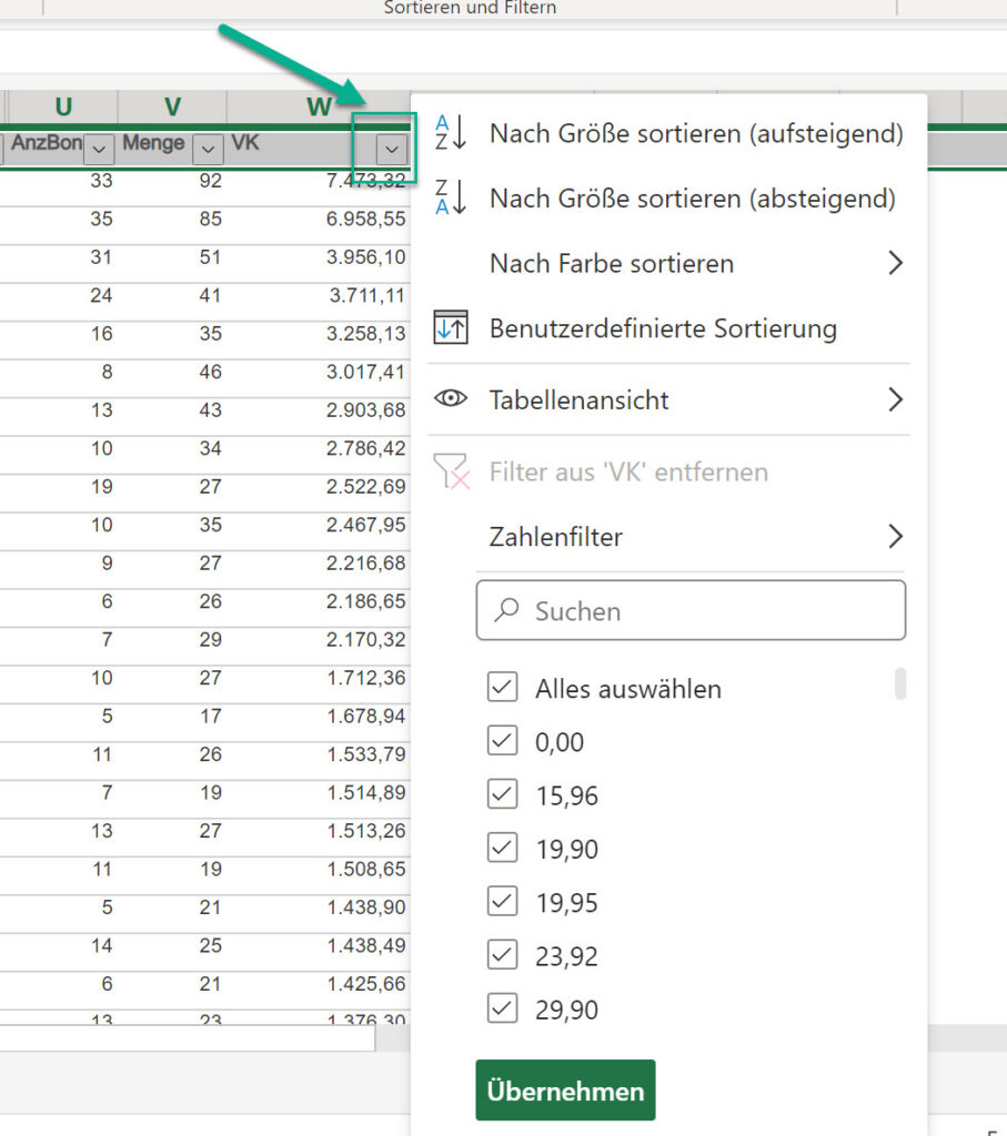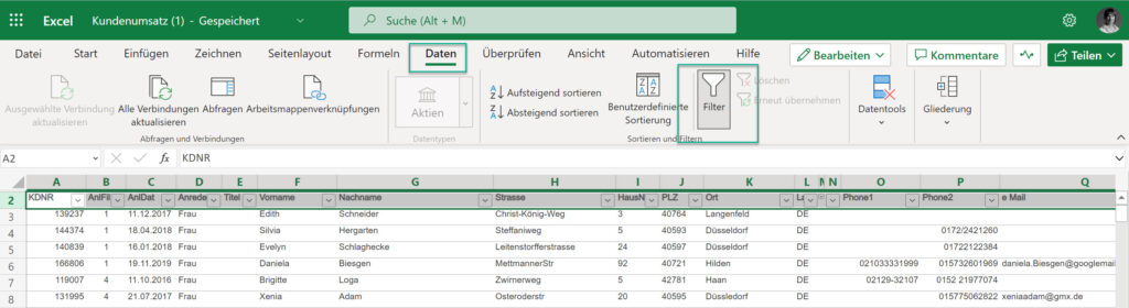 14. Klicke im Menü auf “Daten” und dann auf “Filter” (die zweite Zeile ist weiterhin markiert)