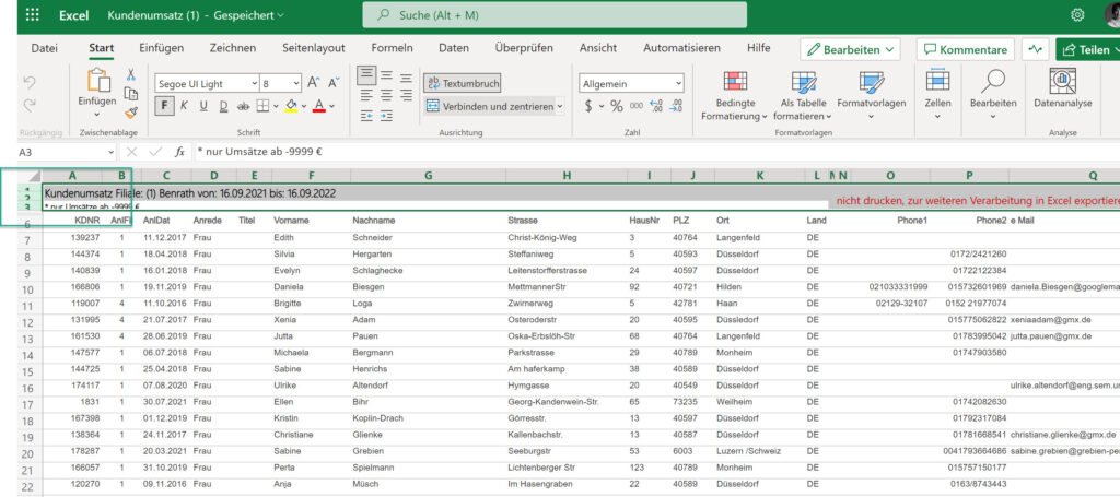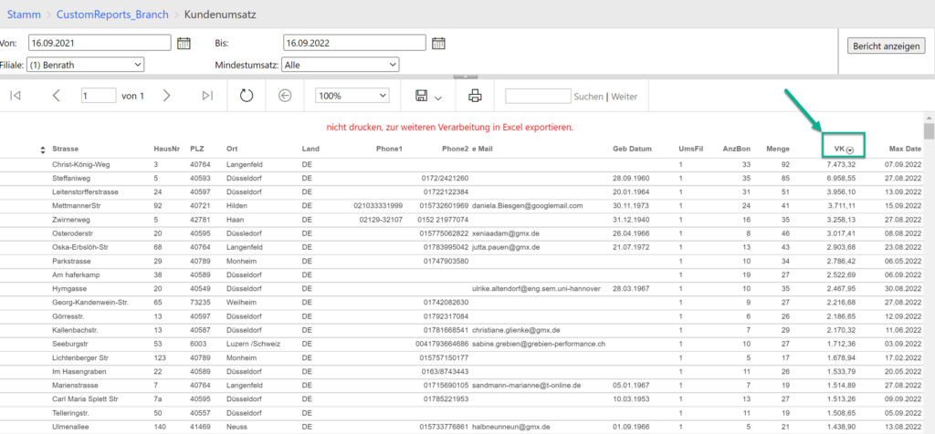 5. Deine Kundenliste wird dir nun angezeigt. Wir empfehlen dir die Liste absteigend nach Umsatz zu sortieren bevor du die Datei herunterlädst. Hierfür klickst du zweimal auf den Pfeil im markierten Bereich.