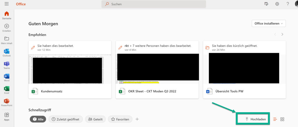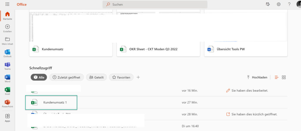 10. Die hochgeladene Liste erscheint nach erfolgreichem Upload in der Anzeige von Office online. Klicke die Kundenumsatzliste an und sie öffnet sich in Excel online.