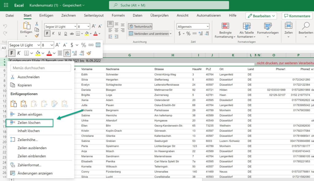 12. Durch einen Rechtsklick auf der Maus öffnet sich das Menü. Wähle “Zeilen löschen” aus