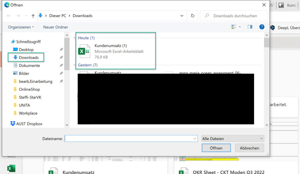 9. Wähle nun die zuvor runtergeladene Kundenumsatz-Liste aus dem Ordner “Downloads” aus. Die Liste wird nun in Excel online hochgeladen und steht nach ein paar Minuten zur weiteren Bearbeitung für dich zur Verfügung.