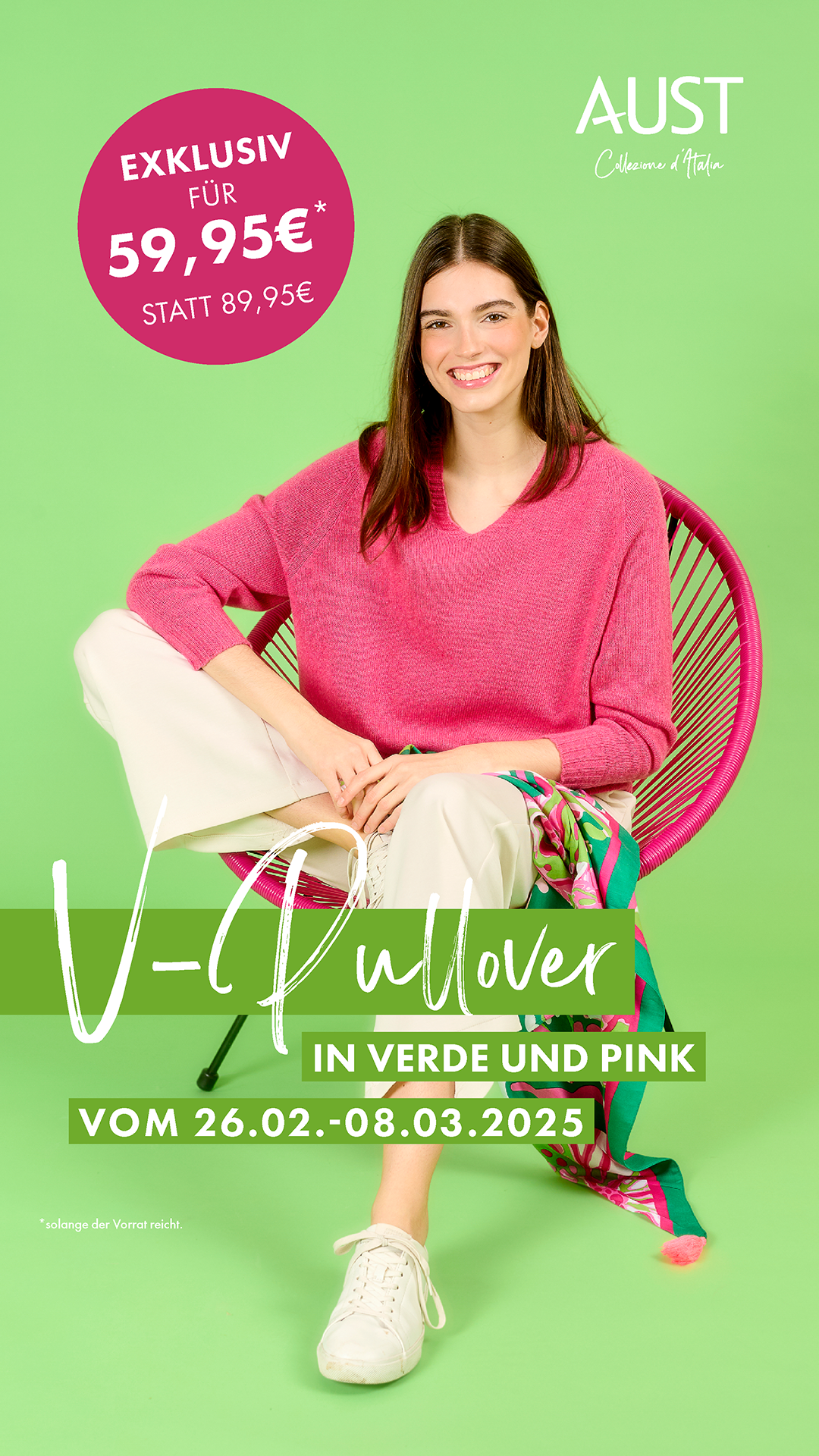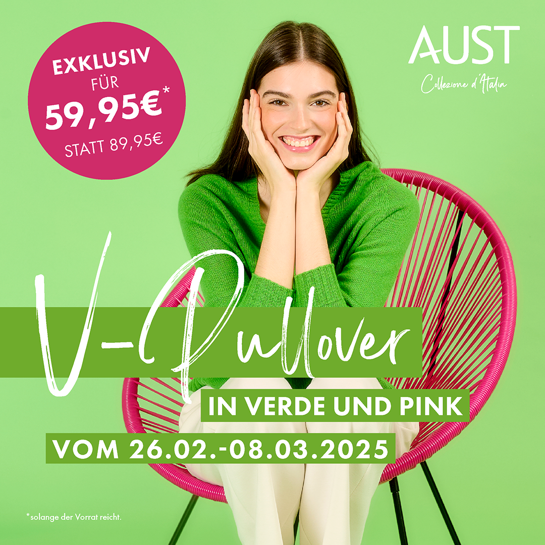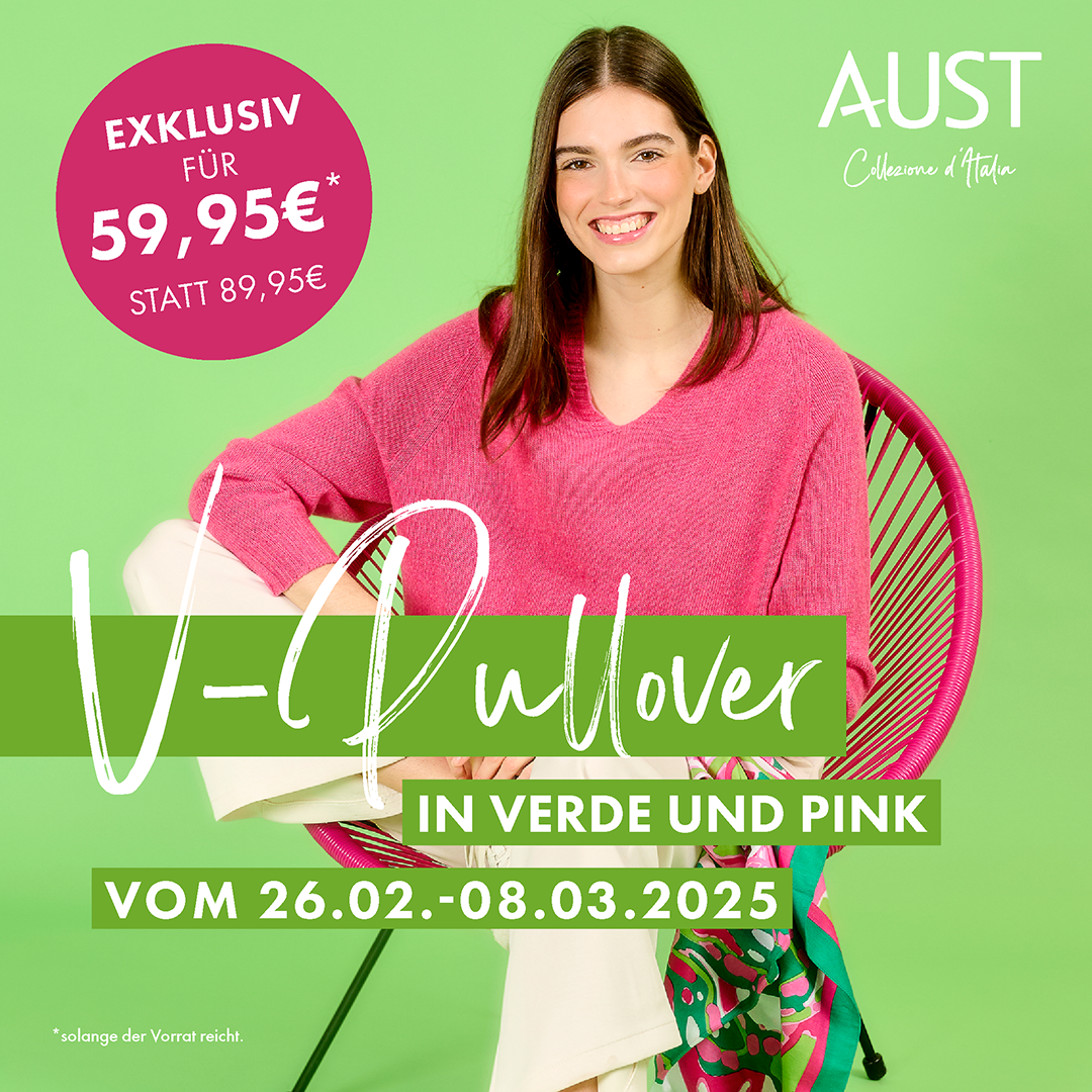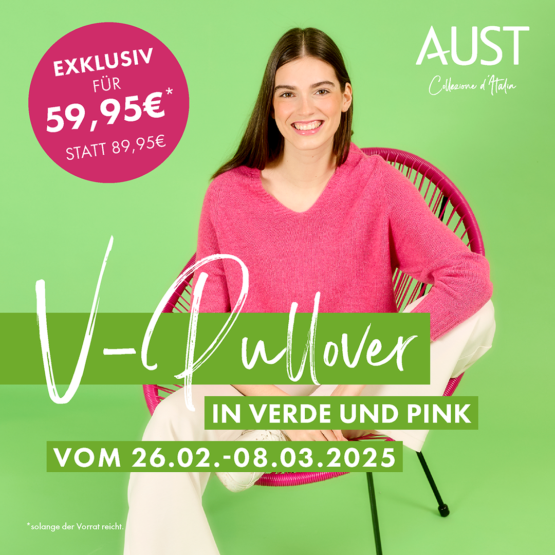 Vom 26.02. – 08.03.25 (+ 09.03. für Standorte mit Sonntagsöffnung) erhalten eure Kundinnen unsere wunderschönen V-Pullover in zwei Knall-Farben, die Lust auf Sonne und wärmere Tage machen. Und das zu einem absolut einmalig exklusiven Preis: 59,95€ statt 89,95€!