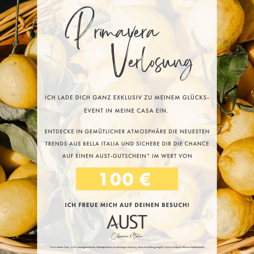 Lade deine Kundinnen ein, den Frühling mit offenen Armen zu empfangen, sich inspirieren zu lassen und ihr ganz persönliches Glücksmoment zu erleben! Denn genau jetzt ist der perfekte Zeitpunkt, um mit neuer Energie durchzustarten und mit etwas Glück ein ganz besonderes Highlight zu gewinnen – einen 100€ AUST Gutschein! 🍋✨