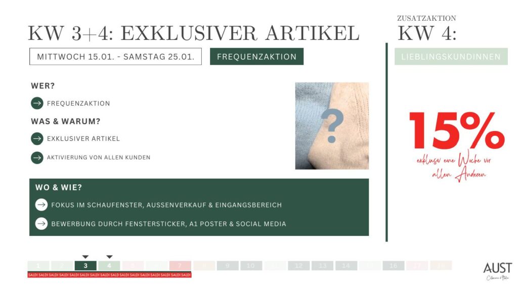 Druckt beide Dokumente aus, platziert diese an der Kasse und informiert eure Mitarbeiter über die generelle Aktion und Wichtigkeit der Auswertung. Bitte fragt jeden “Neu”-Kunden – dies lässt sich super charmant ins Gespräch einbinden, denn wir wollen unsere Kundinnen ja immer besser kennenlernen “Ich freue mich sehr, dass Sie heute bei mir sind. Es würde mich total interessieren, was Sie zu mir in die Casa gelockt hat? Mögen Sie mir das verraten?” Optional: “Ich habe hier ein paar Ideen (Zettel hinlegen), vielleicht passt ja eine direkt.”