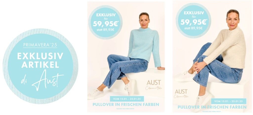 Da es sich um eine zeitlich beschränkte Exklusiv-Aktion handelt, sind die Pullover in der Kasse mit dem regulären Preis von 89,95€ angelegt. Bitte diesen im Zeitraum vom 15.01. (sobald Ihr die Pullover in der Casa habt) bis 25.01. beim Kassieren über Zeilenrabatt und Artikelrabatt€ mit 30€ rabattieren. So wird dies in der Abrechnung korrekt berücksichtigt und die Kundin sieht die tolle Ersparnis auch direkt auf dem Kassenbon.