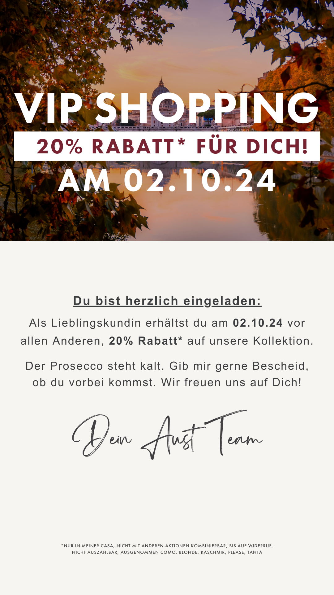 🧡 Zusätzlich stellen wir euch unten Social Media Material für die allgemeine 20% Aktion. VIP Einladungen für das Pre-Event am 02.10.24 (Gerne die Einladungen ab dem 29.09. versenden) und für die Sonntagsöffnung am 06.10.2024 zur Verfügung.