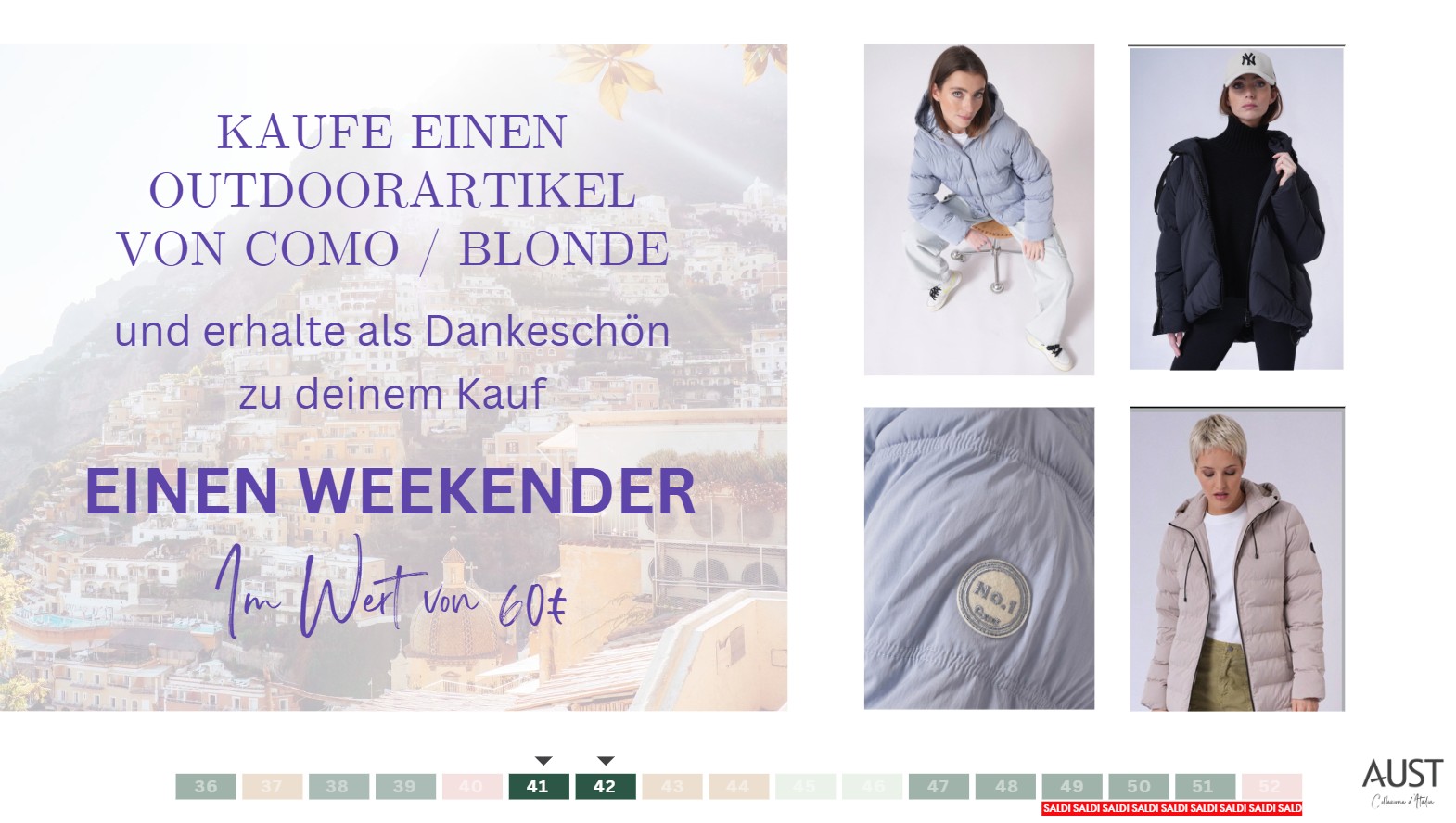Wichtig: Wenn ihr eine Aktions-Jacke verkauft , personalisiert bitte den Bon und sendet dann eine Email an Valentina (vh@austfashion.de) mit dem Betreff: Weekender. In dieser Email bitte jeweils folgende Infos aufnehmen:
