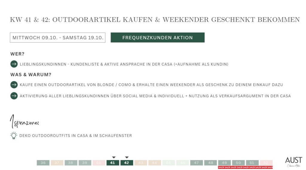 Eine tolle Aktion für alle Kundinnen – nutze alle Medien, sowie deine Casa aktiv zur Bewerbung! Wir freuen uns viele Lieblingskundinnen und neue Kundinnen zu sehen! Mein Tipp: Mache individuelle Fotos der tollen Ourdoor Jacken und Weekender mit dir oder vor einem tollen Hintergrund deiner Casa! So haben die Kundinnen eine direkte Verbindung zu Dir!
