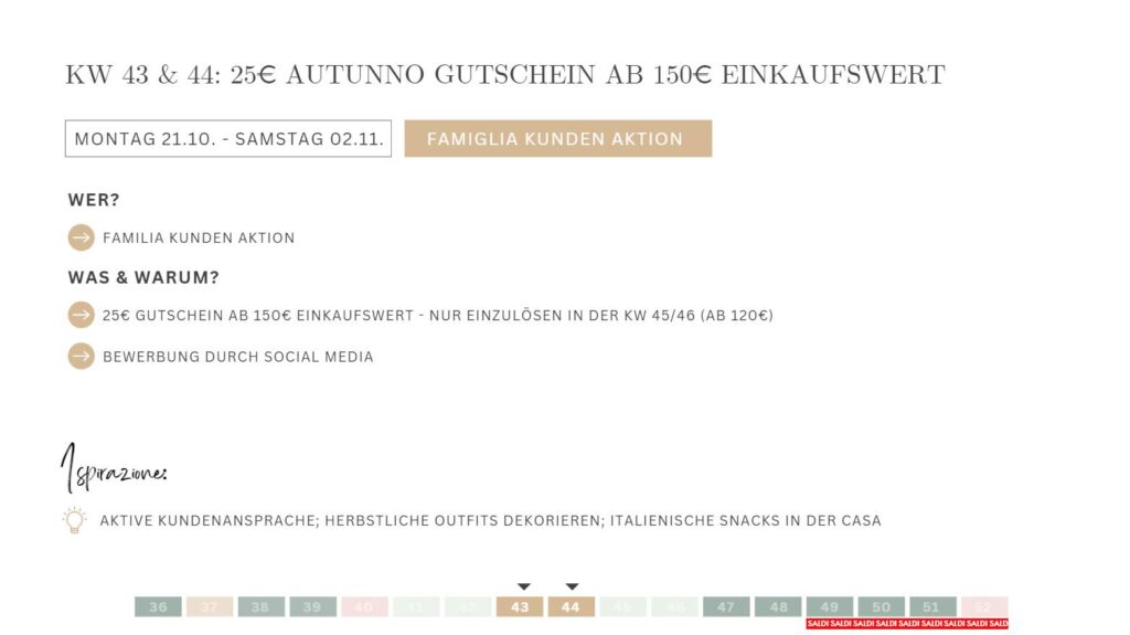 - Unser Tipp: Führe eine Liste der Kundinnen, welche bei dir gekauft und den 25€ Gutschein erhalten haben (inkl. gekauften Artikeln) ->so kannst du alle Kundinnen super in 3 Wochen an den Einlösungsstart der Aktion erinnern (Aktivierung & Wiederkehr)