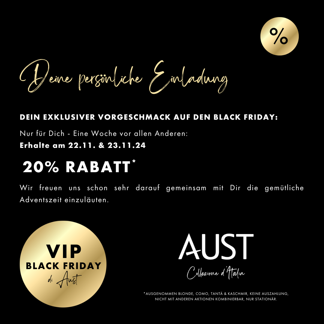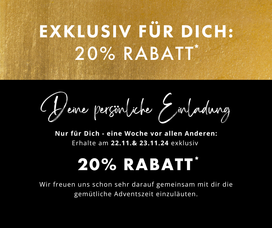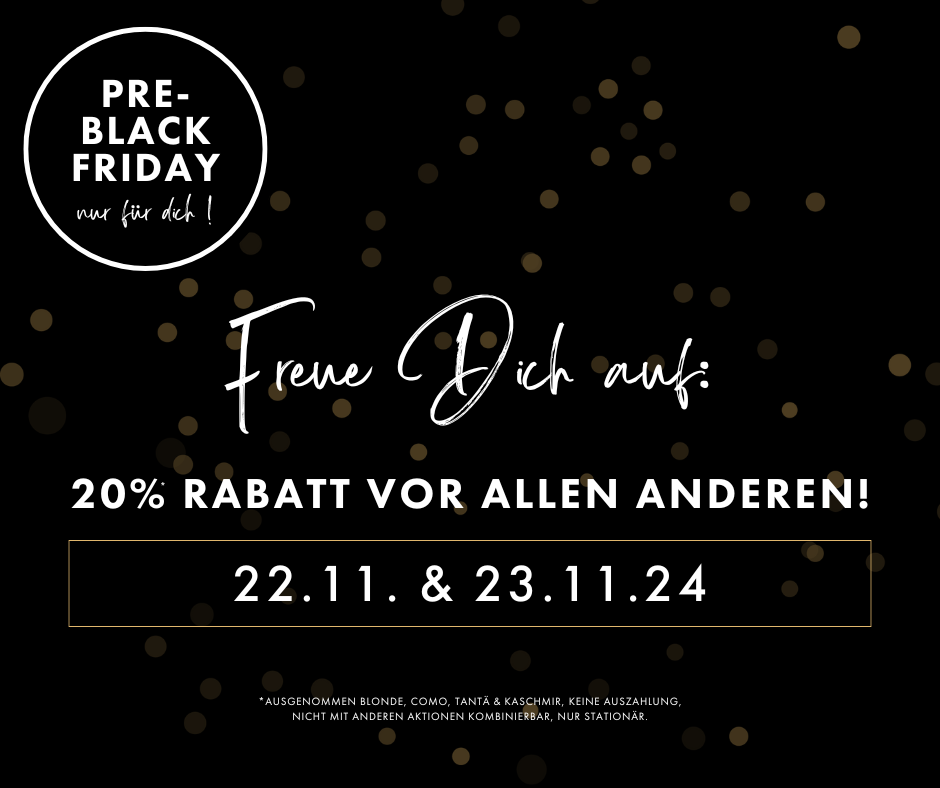 Vom 22. bis 23. November 2024 erhalten eure Lieblingskundinnen beim Pre Black Friday exklusiv 20% Rabatt* – und das noch vor dem großen Black Friday Trubel! Es ist euer kleines Dankeschön für ihre stetige Treue und ein liebevoller Moment, um ihnen zu zeigen, wie wichtig sie für euch sind.