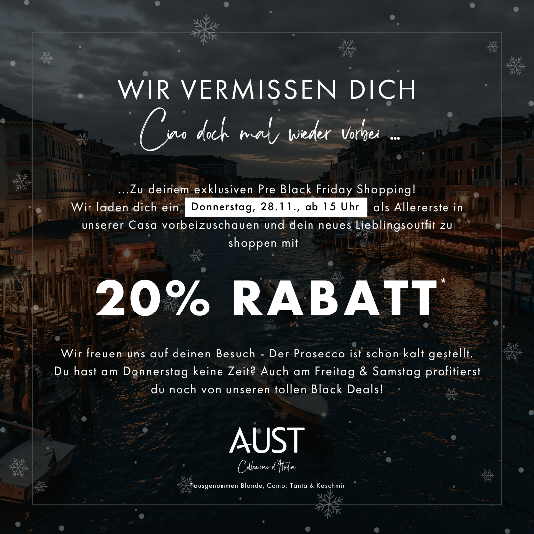 -> Am Donnerstag (28.11.) gibt es nochmal ein exklusives Pre-Shopping für eure Lieblingskundinnen! Ab 15:00 erhalten Stammkunden bereits die 20% (vor allen Anderen).
