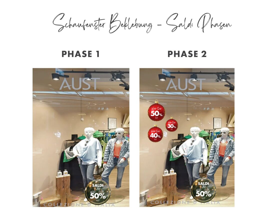 - Unsere Saldi Aktion ist im Dezember in zwei Phasen aufgeteilt. Bitte bringt zuerst den großen, grünlichen “Saldi di AUST” Sticker an. Für die zweite Phase erhaltet ihr drei weitere dekorative Sticker als Ergänzung. Ein Stickerset besteht also aus 4 Aufklebern. Die Menge an Stickersets, die ihr erhaltet, richtet sich nach eurer Schaufenstergröße. Das Bild im Anhang veranschaulicht wie das Stickerset angebracht wird.