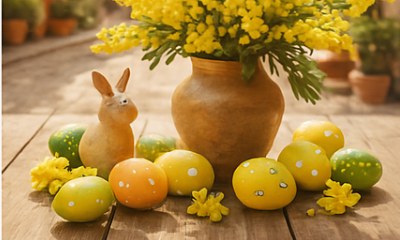 - Zarte Oster-Elemente wie bemalte Eier oder kleine Keramikhäschen oder zarte Schleifen.