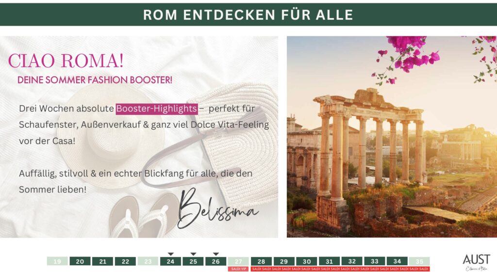 Laue Sommerabende, vibrierende Straßen, Mode mit Charakter und das echte „Dolce Vita“-Gefühl liegen in der Luft. Und genau das holen wir in unsere Casa! Mit der Aktion „Ciao Roma – Dein Fashion Booster“ sorgen wir über 3 Wochen hinweg für Frequenz, Fashionlust und italienisches Lebensgefühl.