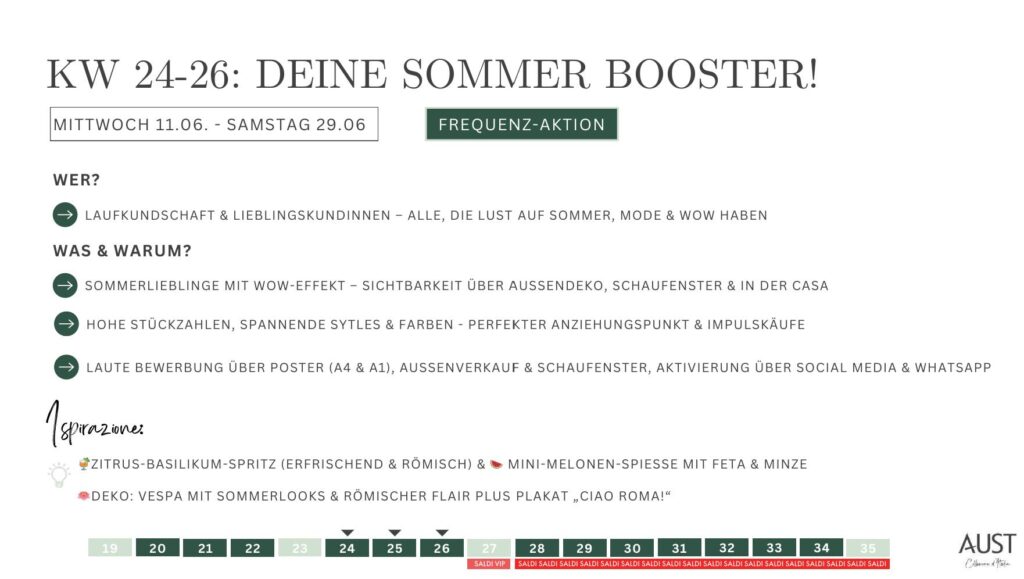 Wir bringt Bewegung auf die Fläche: obspontan vorbei flanierende Laufkundschaft & gezielt eingeladene Lieblingskundinnen – der Fashion Booster sorgt für Aufmerksamkeit und Frequenz.
