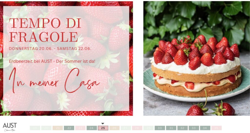 Erdbeerzeit bei AUST – lass uns gemeinsam feiern! Bei süßen Erdbeeren, feinen Köstlichkeiten und prickelndem Erdbeer-Spritz stöbern wir durch unsere Kollektion und genießen die Leidenschaft und Lebensfreude Italiens. Lassen dich von der