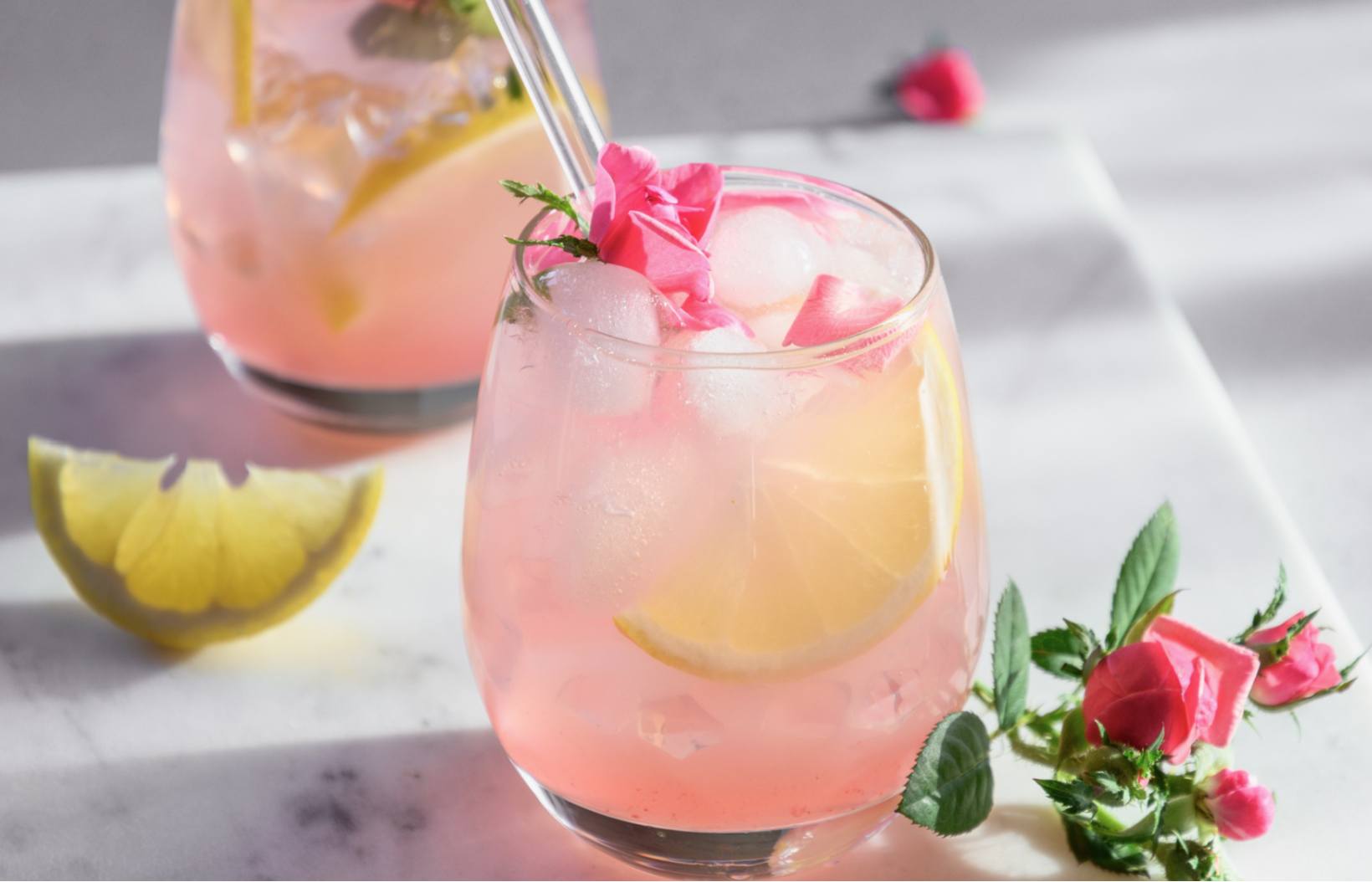 Essbare Blumen oder Eiswürfel mit rosa/roten Beeren sind ein zusätzlicher Hingucker!