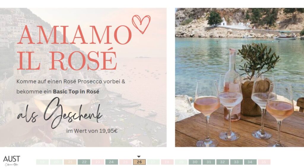 In diesem Beitrag findest du alle Informationen zur Retailaktion “Amiamo il rosé” – Eine Aktion Fest rund um unsere Lieblingsfarbe ROSA! Diese findet in der KW26 vom 26. – 29.06.2024 statt: