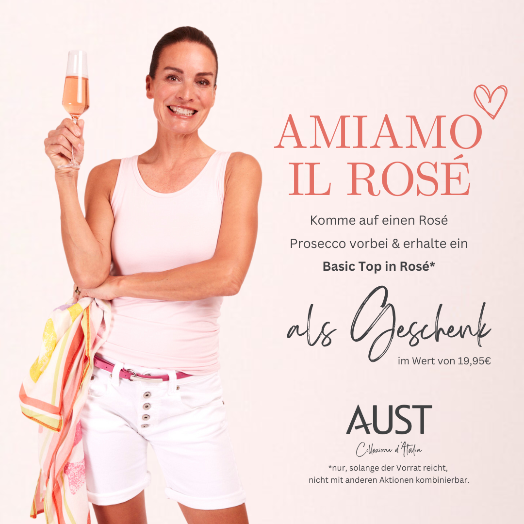 Amiamo il rosé bei AUST -morgen ist es soweit und wir feiern die Farbe die wie keine andere für den frühen Sommer steht: Rosa! Lass uns mit einem erfrischenden Prosecco anstoßen und hole dir dein sommerliches Basictop in Rosa als persönliches Geschenk ab!
