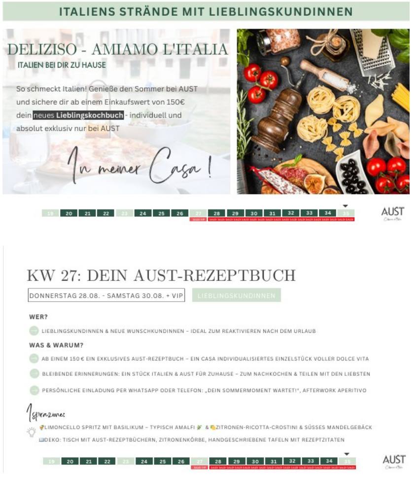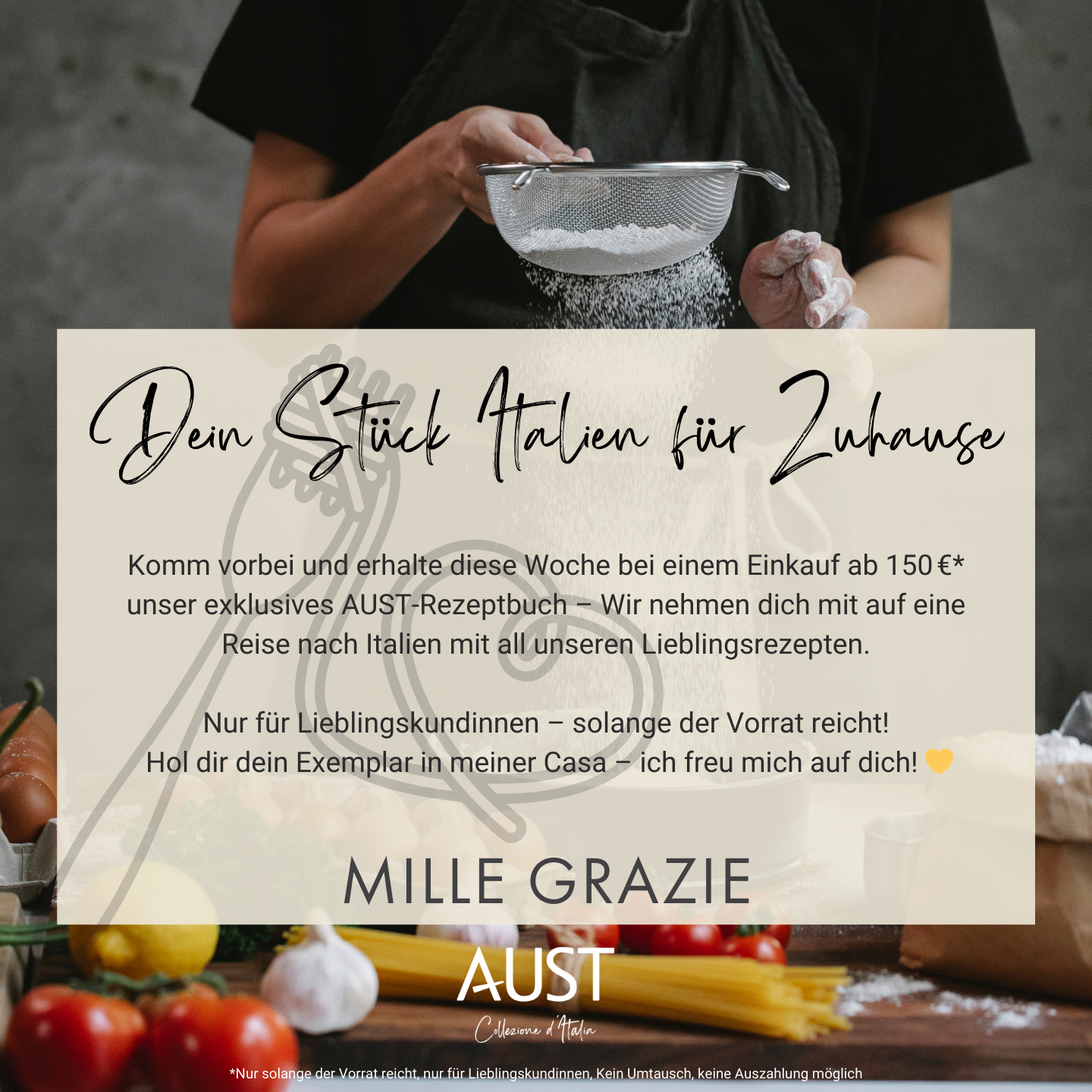 Wer für 150 € oder mehr shoppt, erhält ein exklusives AUST Rezeptbuch – ein kleines Stück „Casa“ zum Mitnehmen nach Hause. Jedes Buch ist ein liebevoll gestaltetes Einzelstück – mit italienischen Rezepten, AUST-typischem Stil & Platz für eine persönliche Widmung von dir!