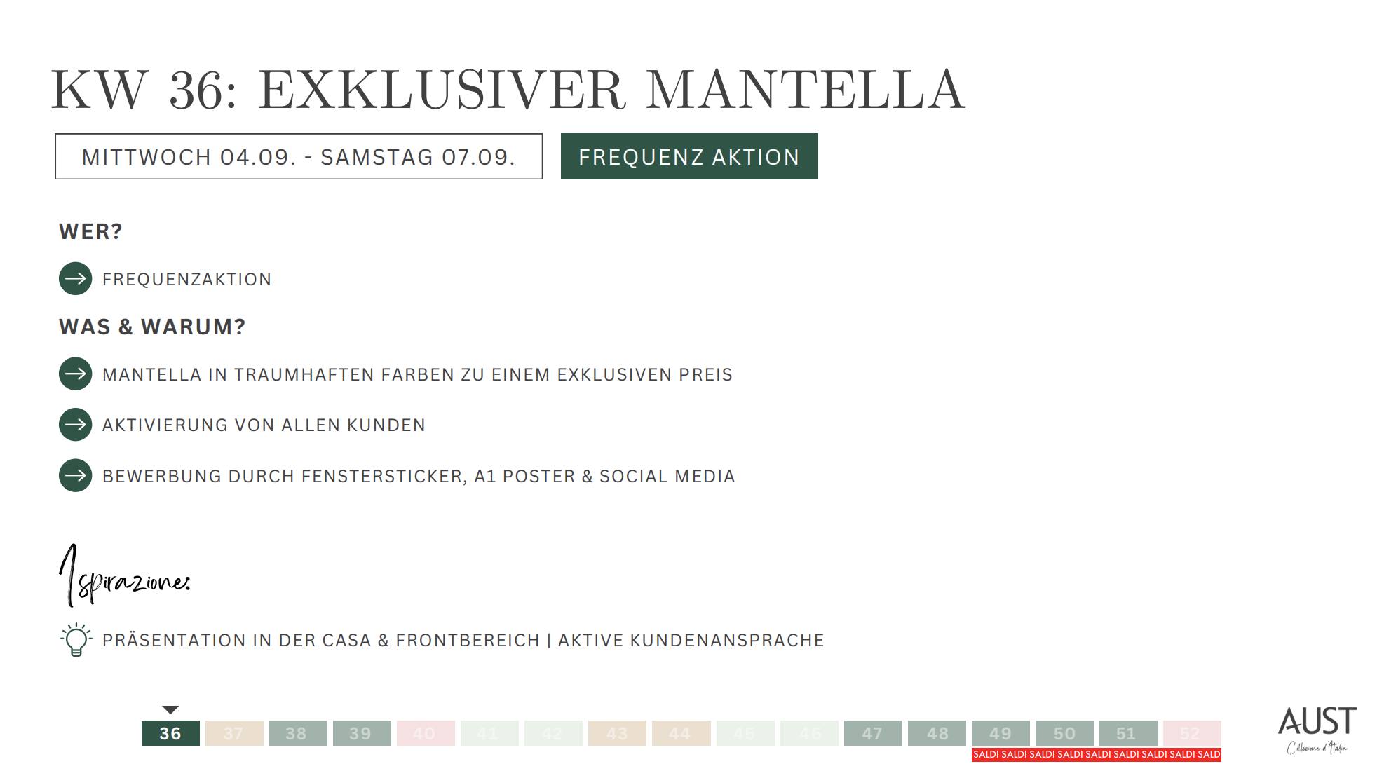Da es sich um eine zeitlich beschränkte Exklusiv-Aktion handelt, sind die Mantella in der Kasse mit dem regulären Preis von 79,95€ angelegt. Bitte diese im Zeitraum vom 04.09. bis 07./08.09. beim Kassieren über Zeilenrabatt und Artikelrabatt€ mit 20€ rabattieren. So wird diese Aktion in der Abrechnung korrekt berücksichtigt und die Kundin sieht die tolle Ersparnis auch direkt auf dem Kassenbon.